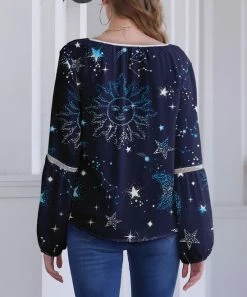 Flash Sale 🎉 Nanu | Dark Blue & Turquoise Moon & Stars V-Neck Chiffon Tunic – 👩 Women & Plus 👍