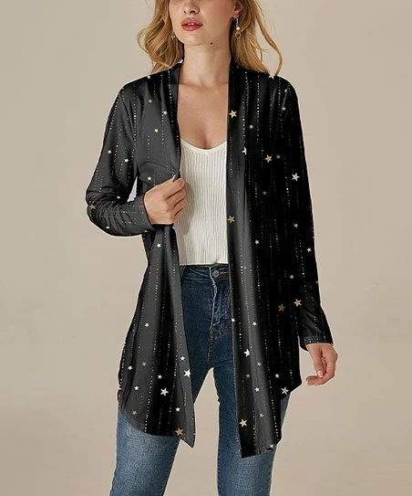 A curved hem lends flowy flair to this breezy open cardi embellished with an expressive pattern and comfortable dose of stretch for all-day easy wear.