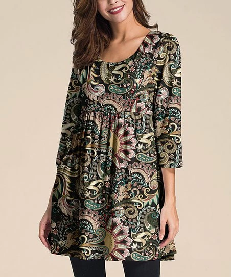 A pleated empire waistline lends flowy flair to this roomy tunic adorned with an expressive print and breezy three-quarter length sleeves.