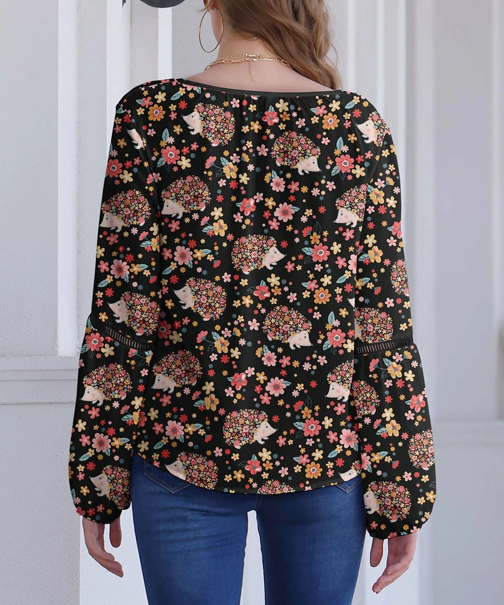 Dress up your everyday looks with this lightweight chiffon top flaunting a sweet hedgehog print and long puff sleeves.