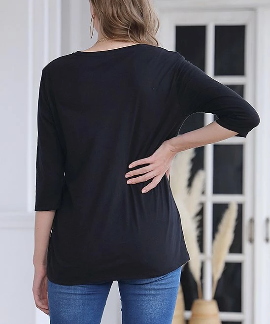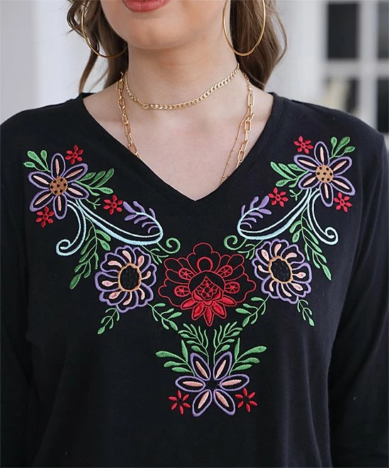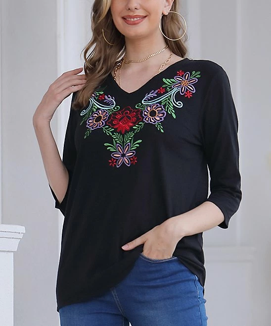 Intricate floral embroidery adds a lovely touch to the v-neck of this top that keeps you comfy all day beneath three-quarter sleeves.