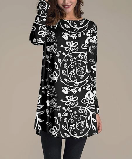 Pair your favorite jeans and leggings with this bold floral long sleeve tunic designed with a lightweight, stretchy material for a comfortable, figure-flattering style.