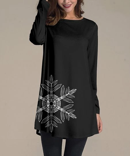 A festive graphic, stretch-blend fabric and a versatile color scheme are all this tunic needs to become a new casual wardrobe staple.