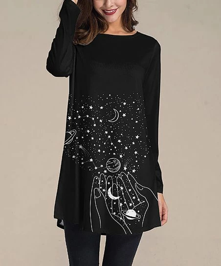 Greet chilly days with your artsy style sense on display by sporting this tunic that shows off a bold print while treating you the coverage of long sleeves. A simple crewneck lets you add a necklace with ease.