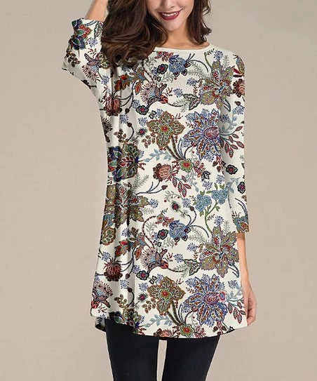 Let this tunic become your next go-to top with its flowy silhouette, three-quarter sleeves and warm floral pattern for those cozy vibes.