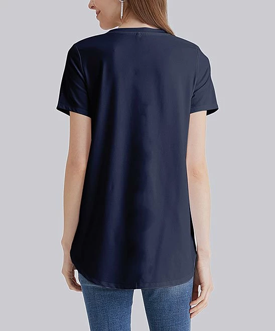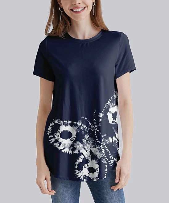 Give casual collections a boost of flair with this stretch-enhanced tee designed with a lively print and curved hemline.