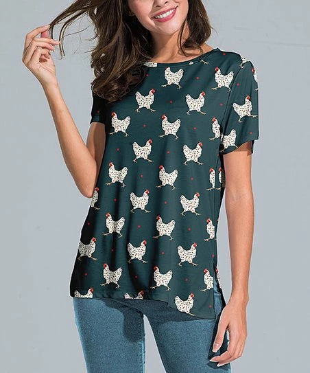 Boost your casual wardrobe with the playful personality of this split-hem tunic featuring a sweet hen graphic and lightweight, stretchy fabric for extra comfort.