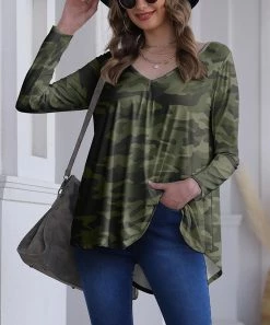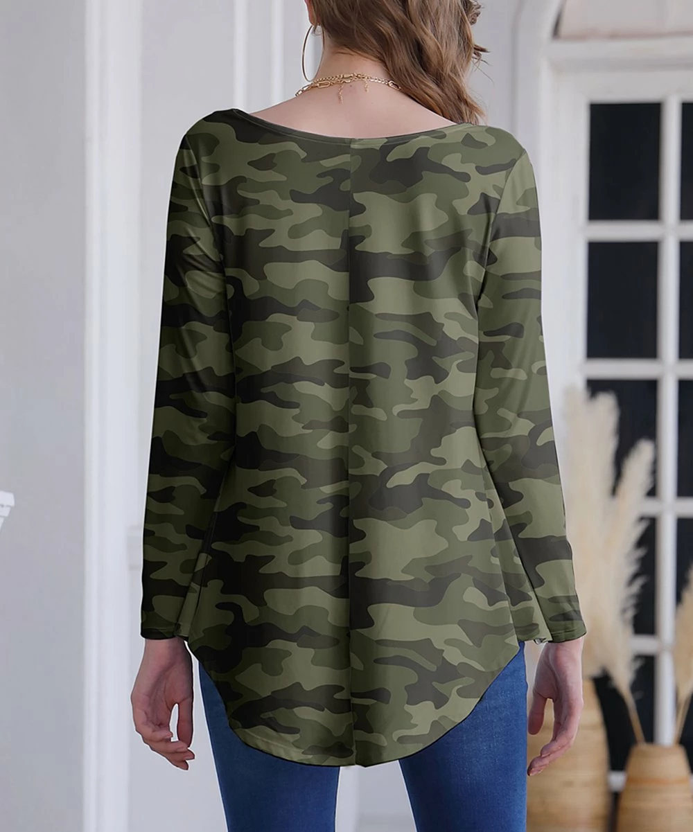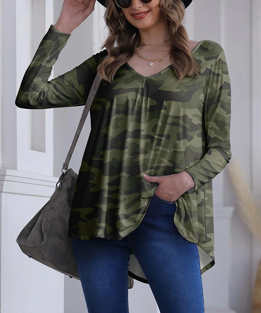Spruce up your everyday lineup with this relaxed-fit tunic sporting a flattering v-neckline and long sleeves for warm coverage. A dynamic camo pattern adds creative style to the mix.