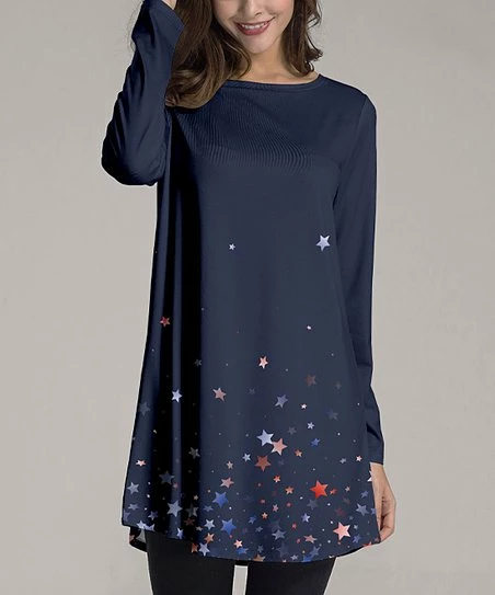 Showcase your patriotic side while staying comfy in this long-sleeved tunic designed with a subtle red, white and blue star print and a relaxed, swingy fit.