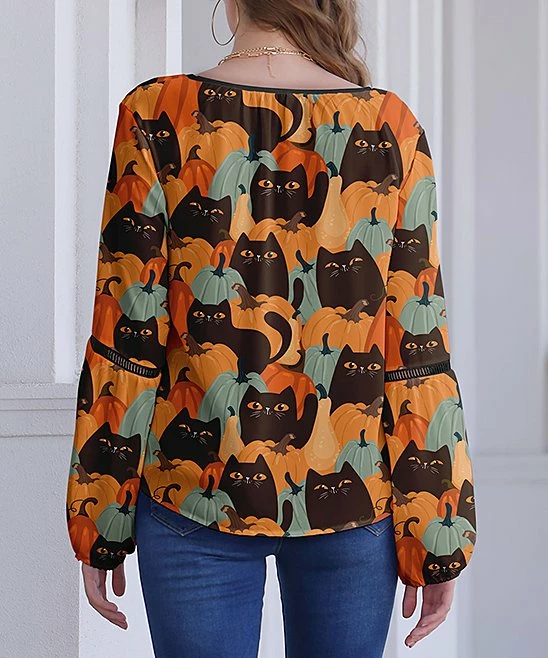 Budget โค๏ธ Nanu | Orange & Brown Cats & Pumpkins V-Neck Chiffon Tunic – ๐Ÿ‘ฉ Women โญ