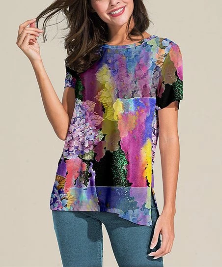 Give casual collections a boost of flair with this stretch-enhanced tunic designed with a lively print and modern slit sides.