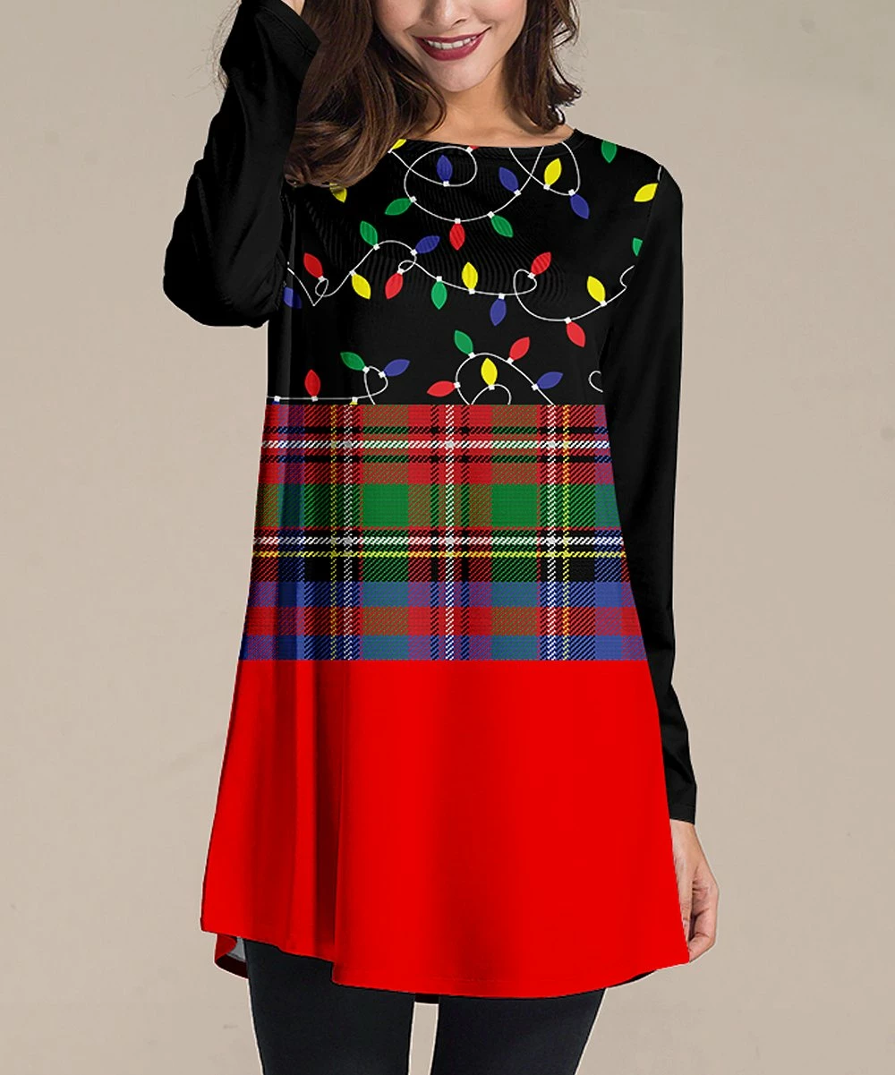 A fetching print and fluttery, relaxed cut lend casual-cool style to this comfy long-sleeve tunic featuring a stretchy fit and on-trend curved hem.